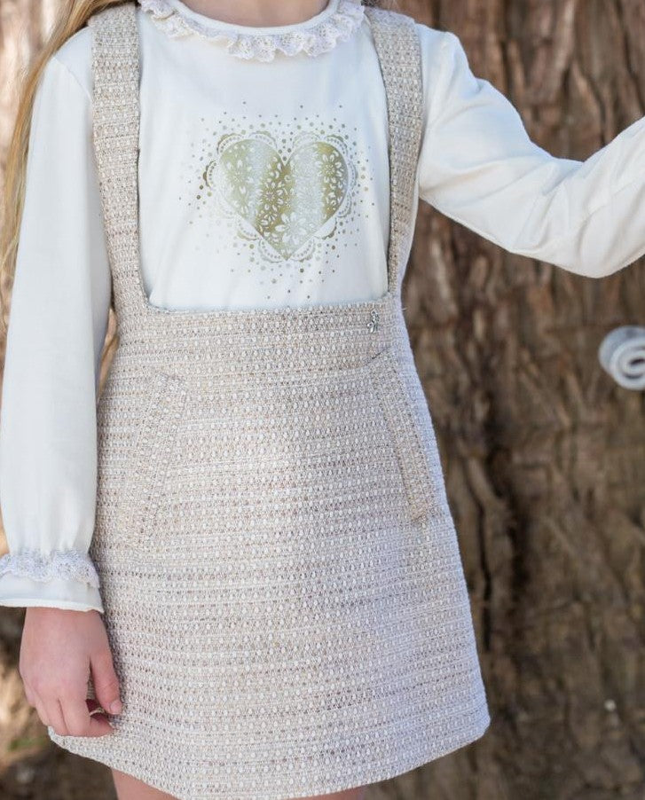 Hermoso vestido color crema y detalles dorados. Se divide en dos piezas blusa de manga larga y vestido.