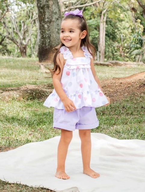 Conjunto de blusa blanca con detalles de bolitas con y pantalón corto color lila