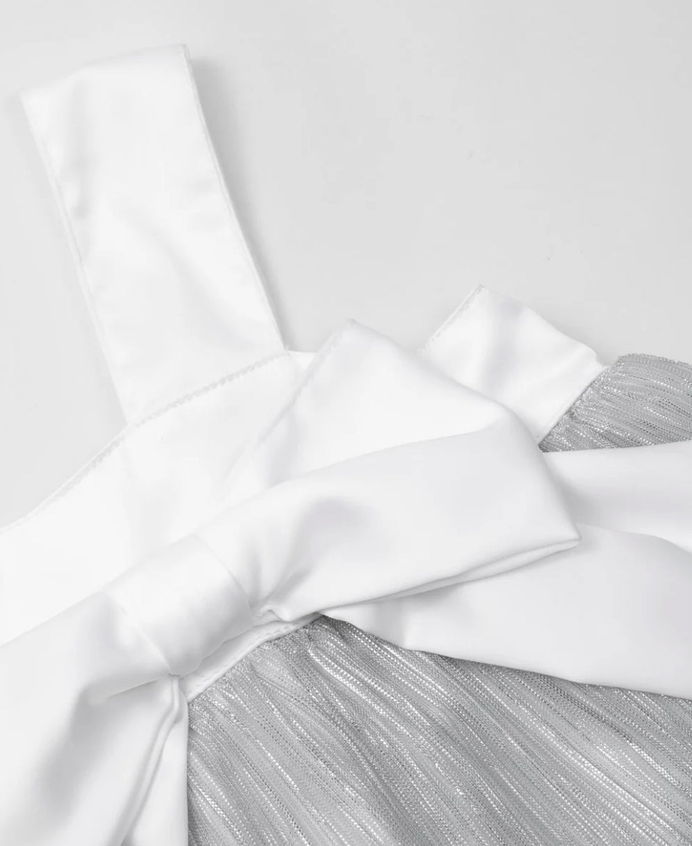 Vestido en satín blanco con moño y tull plisado con brillos plateados