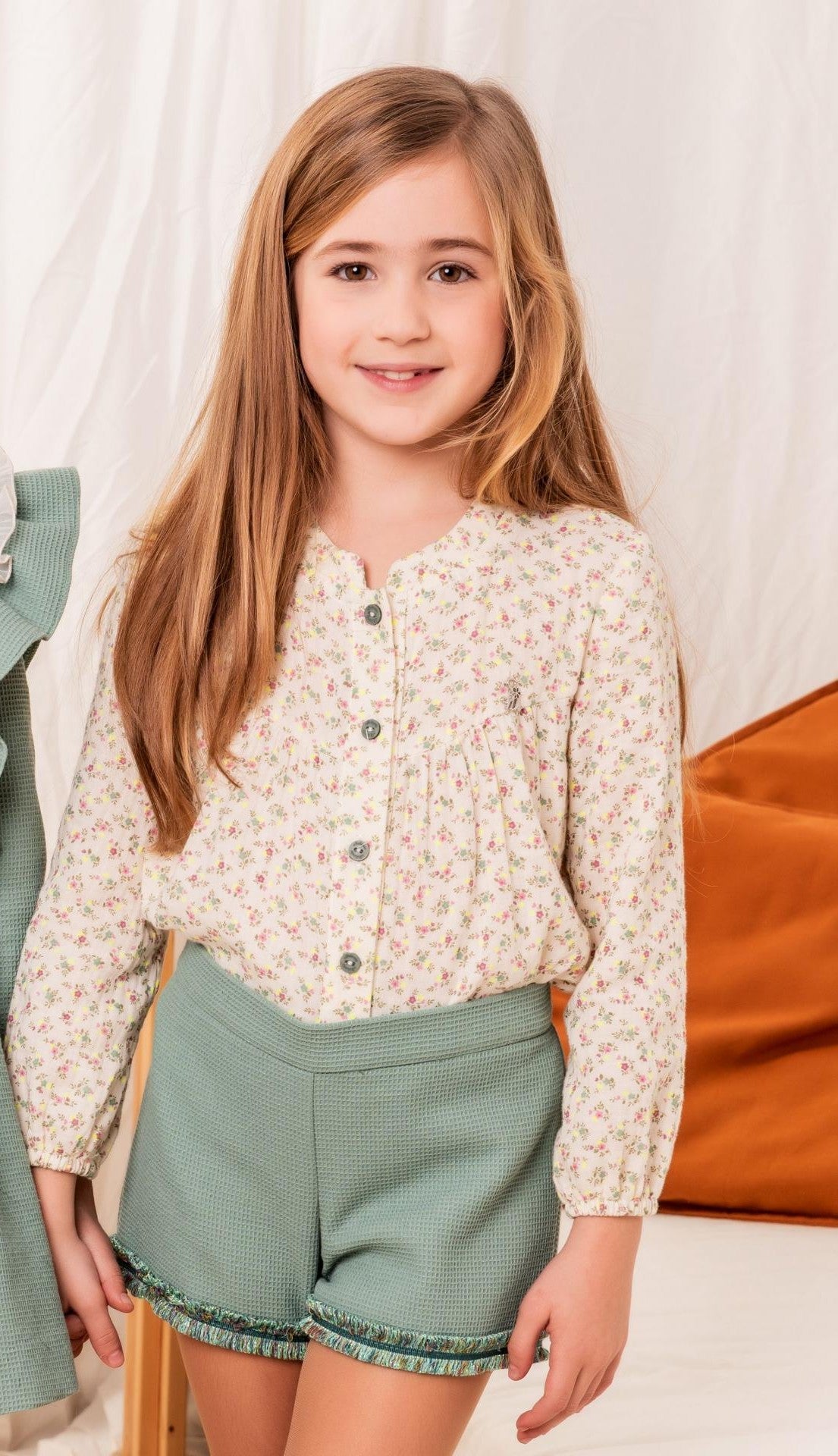 Conjunto de 2 piezas compuesto de blusa estampada de pequeñas flores de manga larga y botonadura delantera, y short de punto verde.